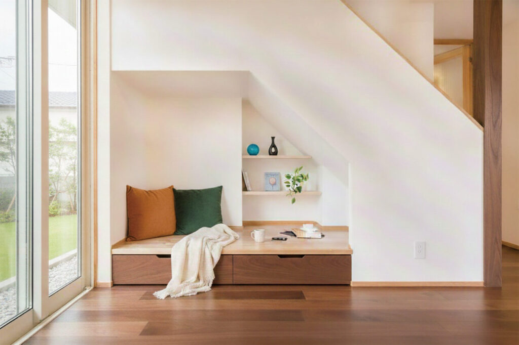 壁で仕切るのではなく、段差や垂れ壁で緩やかに空間を分けることで、家族の気配を感じながら自分だけの時間を過ごせる場所「ヌック」。家族が自然と集まる、住まいの新しい中心地です。足元を収納にしたり、クッションを並べてソファ代わりにしたり。限られた面積を最大限に活かし、暮らしに彩りとゆとりをプラスしてくれます。