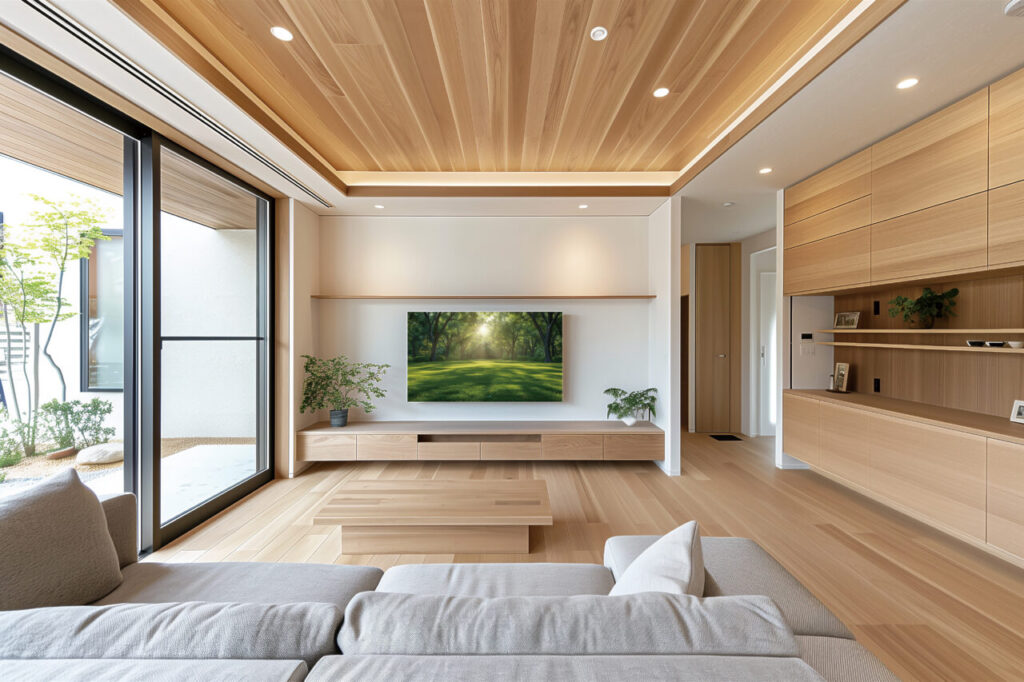 天井の中央部を周囲より一段高く仕上げた「折り上げ天井」。フラットな天井にはない立体的な美しさが、空間全体に上質な雰囲気と洗練されたデザイン性をプラス。リビングやダイニングを、より広々とした、心地よい迎賓空間へとランクアップさせます。単なる装飾ではなく、暮らしの品格そのものを高めるデザインです。
