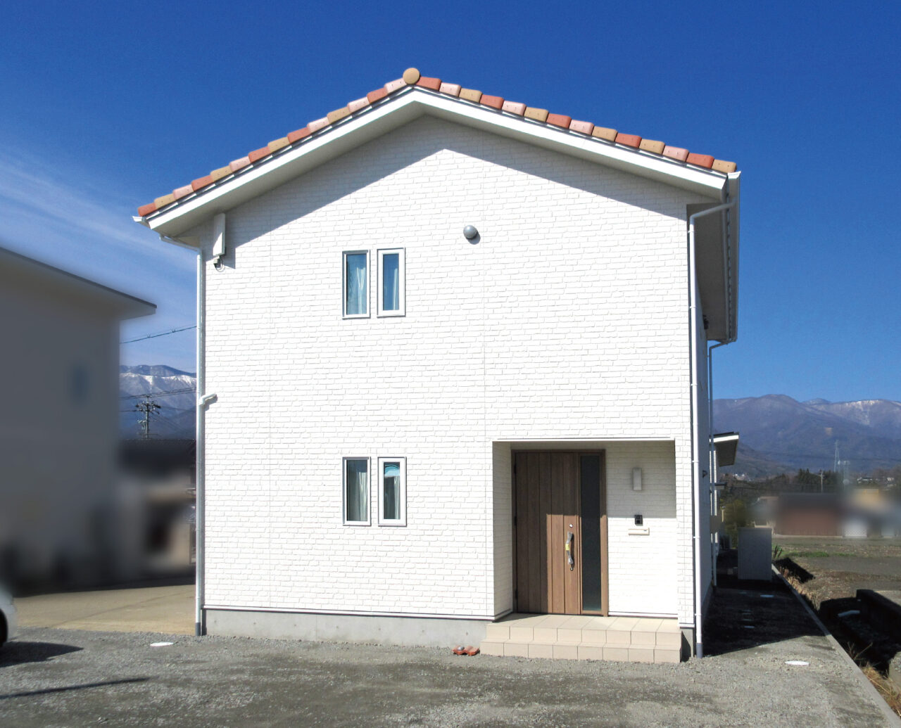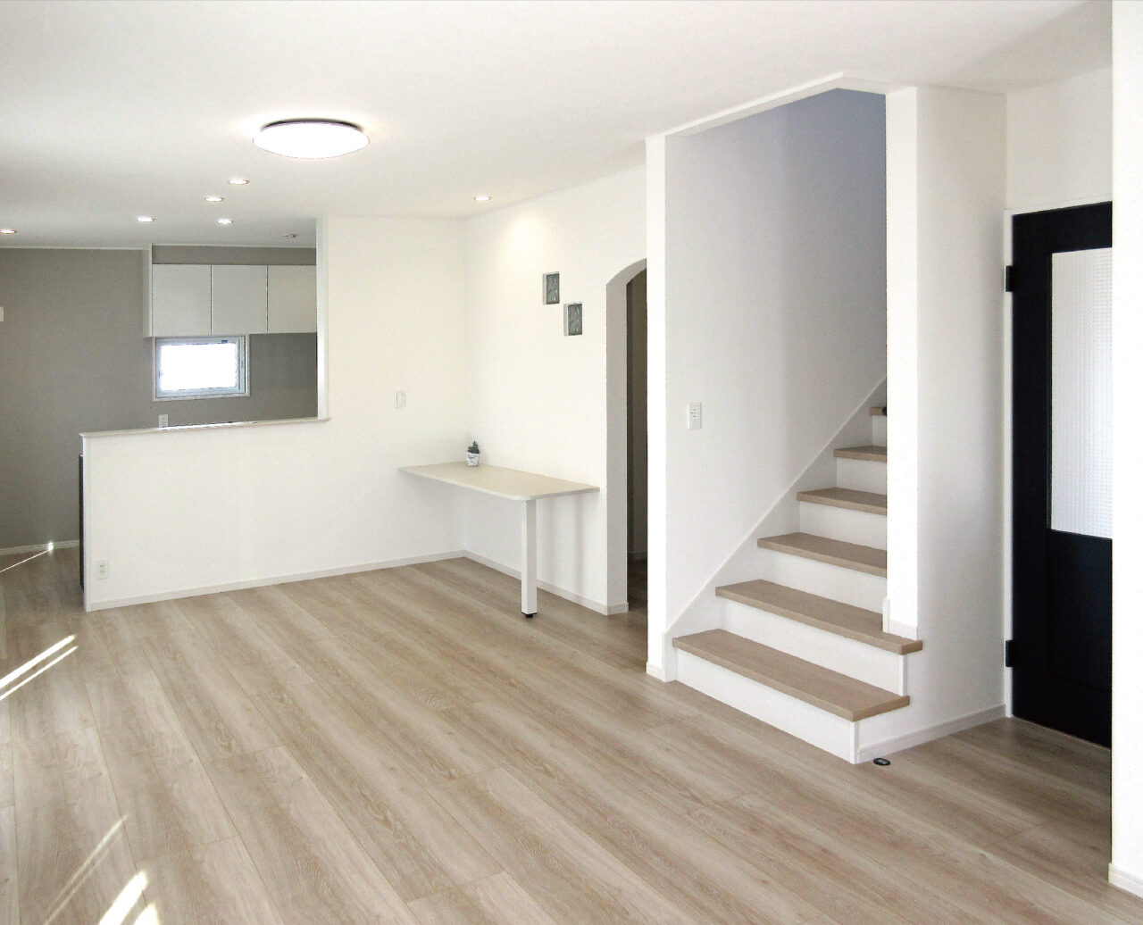 洋瓦を混ぜ葺き(まぜぶき)した南欧風な佇まいが 青空の下に映える白いおうちが完成しました! ・明るい木目フローリングと白い壁で統一された、 自然光がたっぷり差し込む広々リビング ・料理好きに使い勝手の良い広々キッチン ・大容量のパントリー収納でストック類もすっきり ・家族みんなの靴や外道具をしまえる大容量収納で いつもキレイな玄関がお出迎え ・室内干しスペース+収納式物干しを2階に完備 急な雨や花粉の時期も気にせずお洗濯