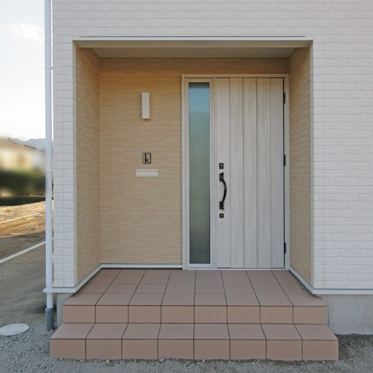 ・上品質なバニラウォールナット柄の玄関扉に やさしい光を採り込むスリット窓をプラス